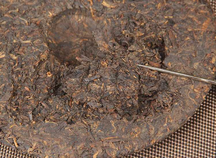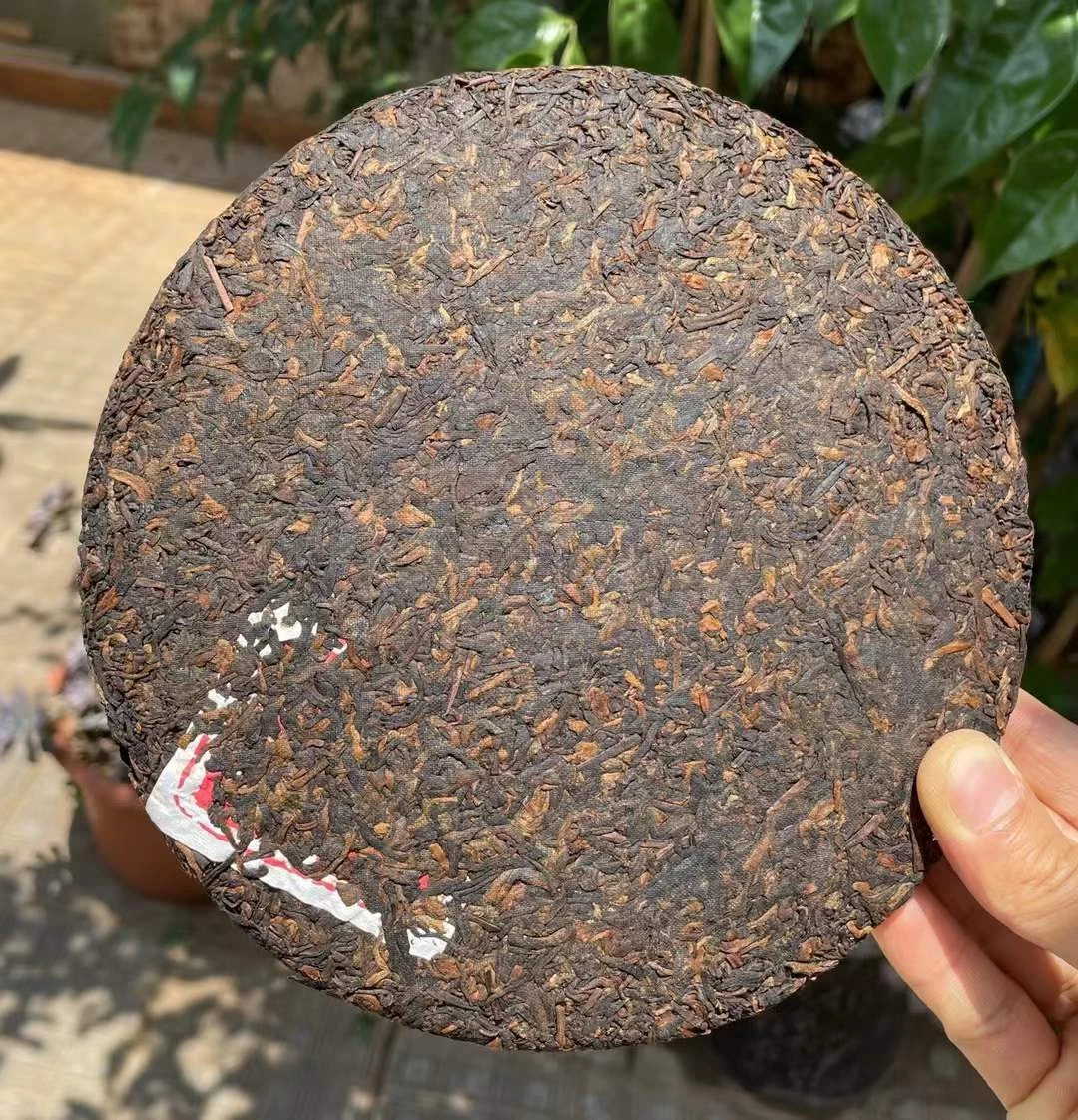 ✨ Bánh trà được ép tròn truyền thống, bề mặt bóng mượt, đầy đặn. Tỷ lệ búp non (芽头) cao, lộ rõ màu nâu đỏ đặc trưng của trà chín lâu năm.